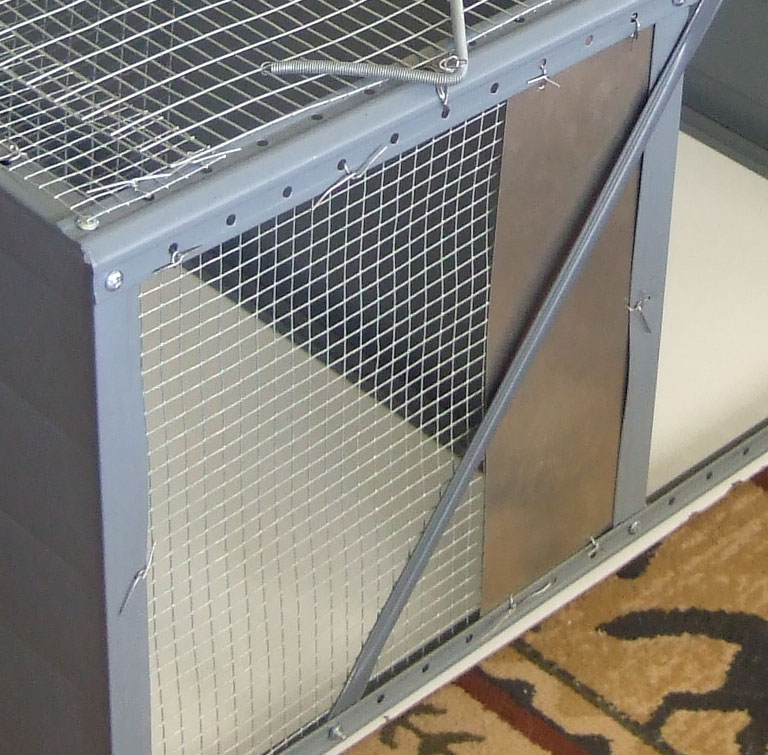 I used some old springs for the doors. Below is the completed breeder cage with feeders and watering system.