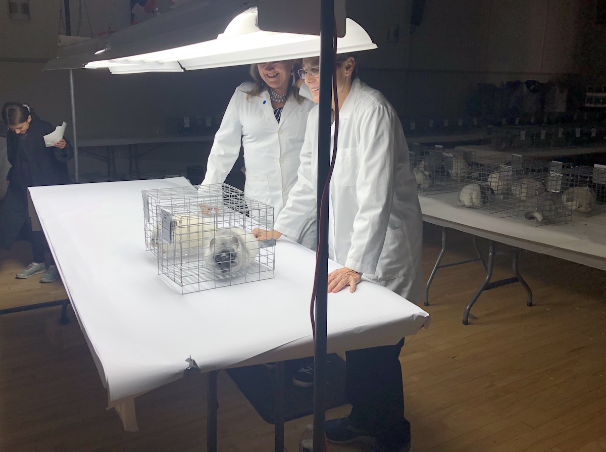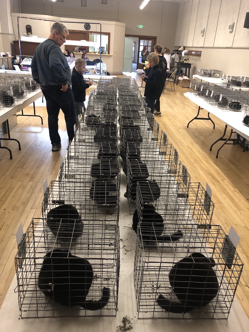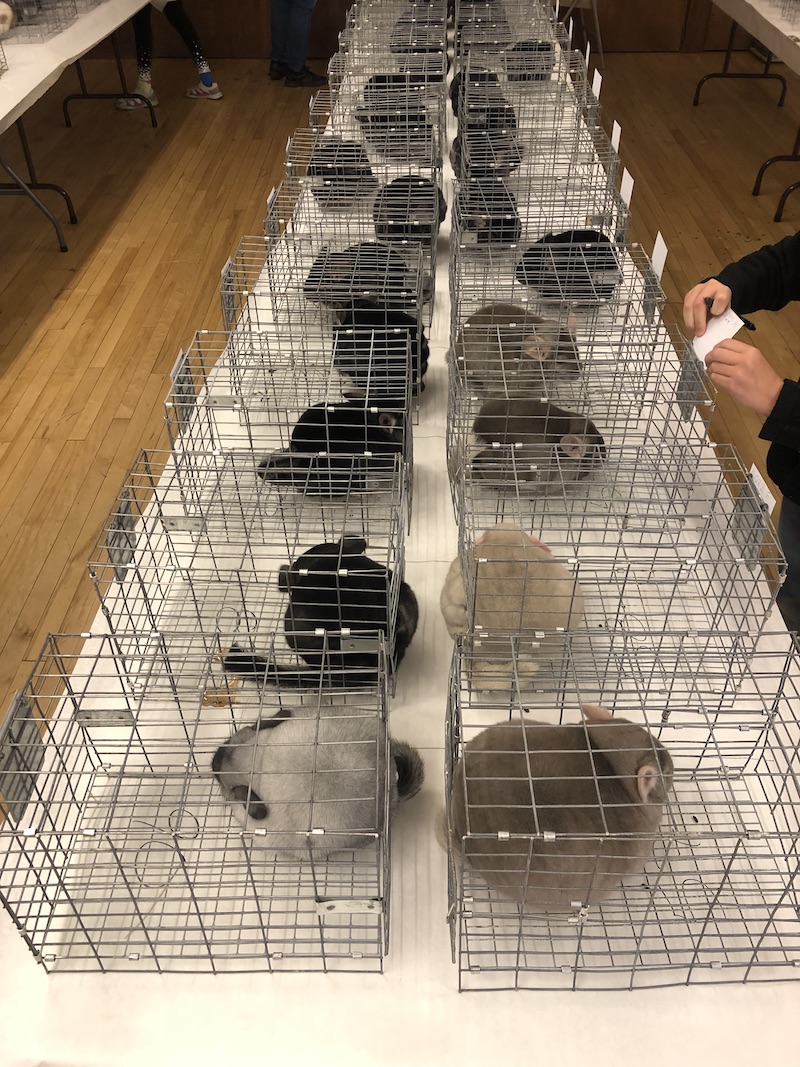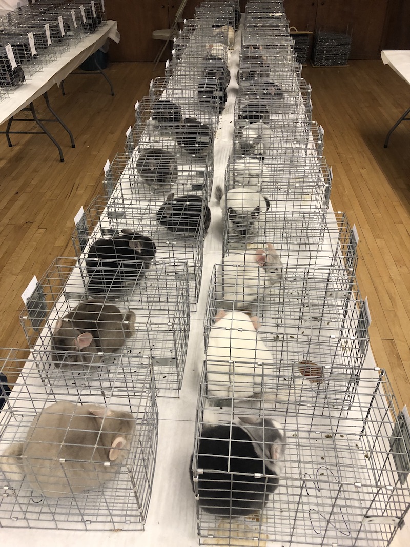 Pictures of the rows of chinchillas in show cages ready to be judged. You can see the different urine colors from light to dark - this is normal, each chinchilla is unique.